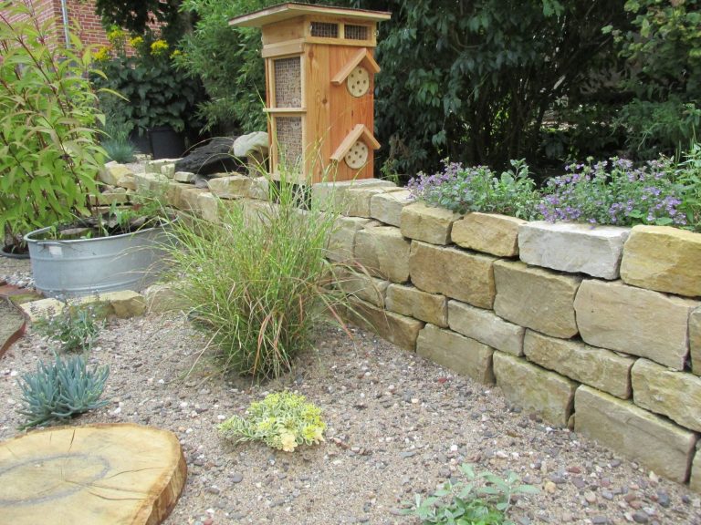 Trockenmauern mit gestaltenden Beeten bieten viel Lebensraum für verschiedene Insekten und Amphibien